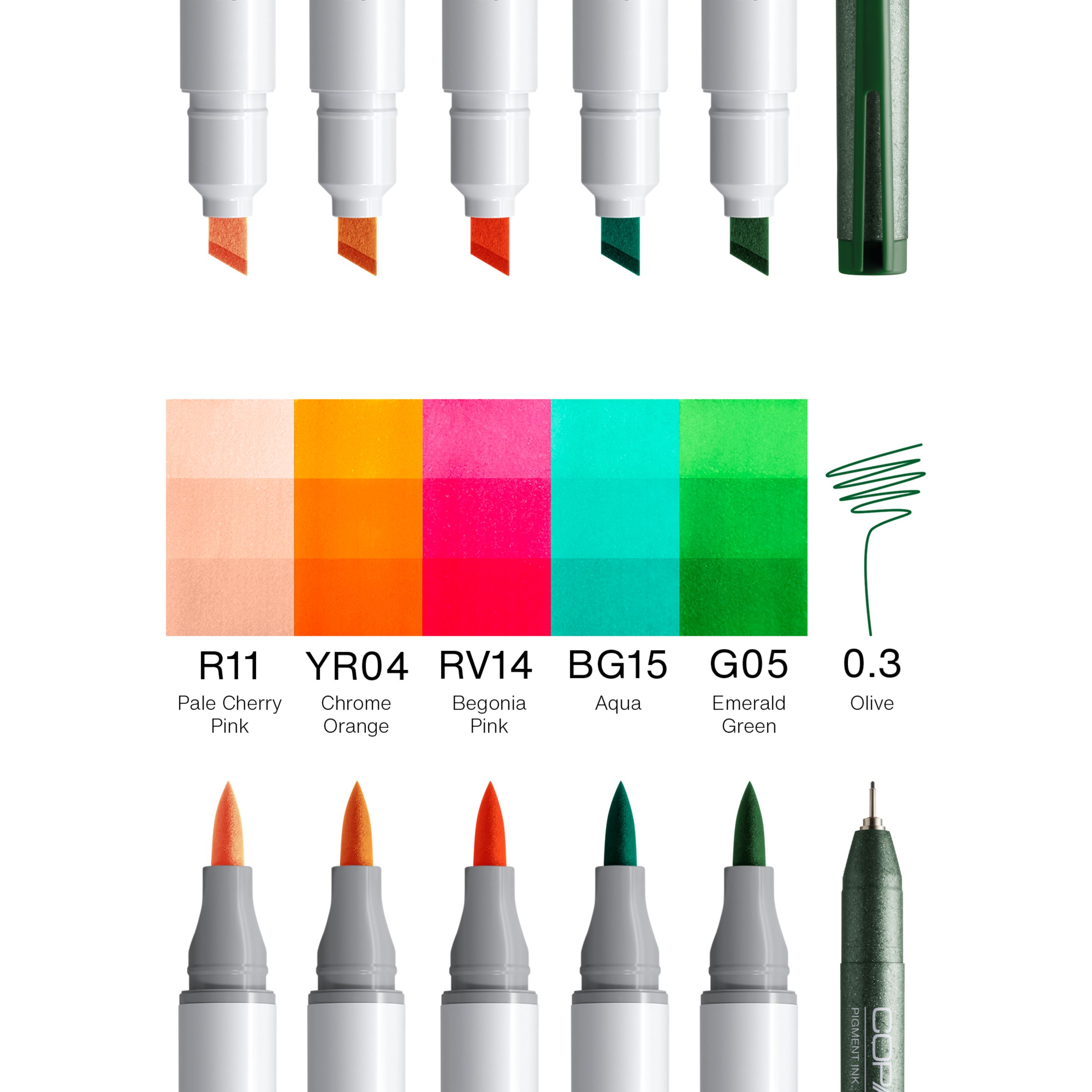 • Enthaltene Tools: R11 (Pale Cherry Pink), YR04 (Chrome Orange), RV14 (Begonia Pink), BG 15 (Aqua), G05 (Emerald Green), Multiliner Olive (0.3 mm)