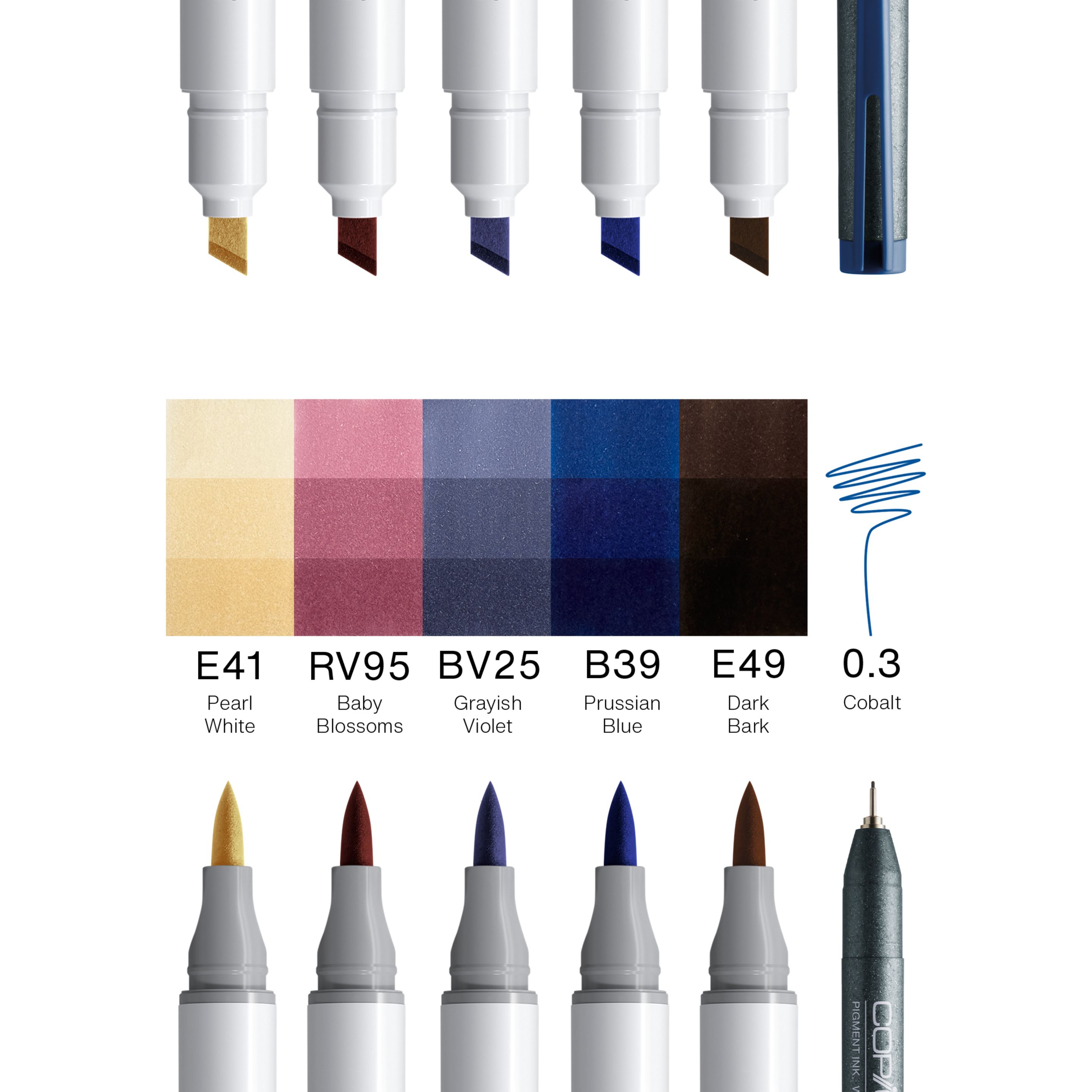 • Enthaltene Tools: E41 (Powder Blue), RV95 (Baby Blossoms), BV25 (Grayish Violet), B39 (Prussian Blue), E49 (dark Bark), Multiliner Cobalt (0.3 mm)