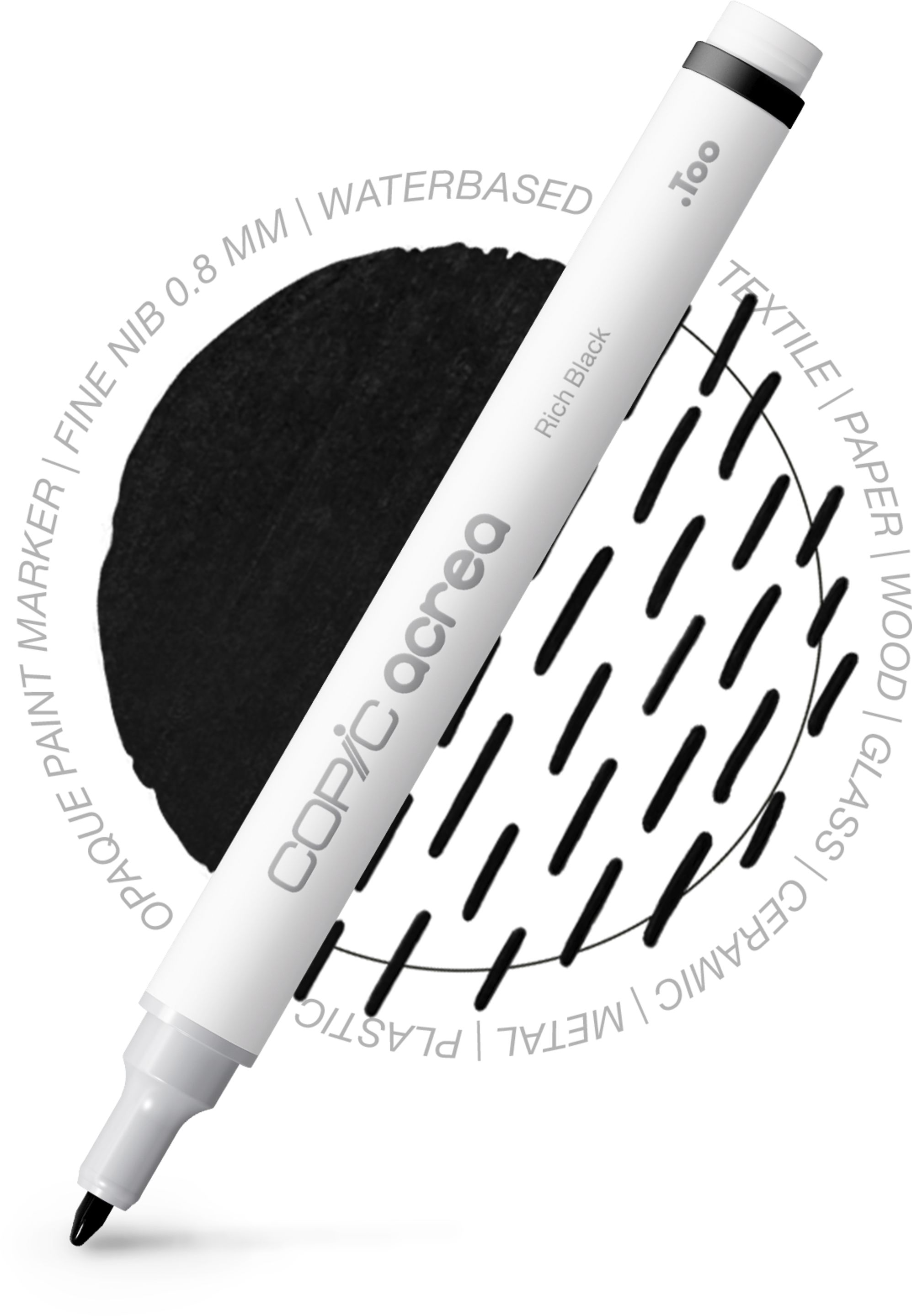 • Der Copic acrea ermöglicht sanften und gleitenden Tintenfluss auf verschiedenen Oberflächen (Papier, Stein, Holz, Kunststoff, Spiegel, Glas, Metall, Stoff etc.)